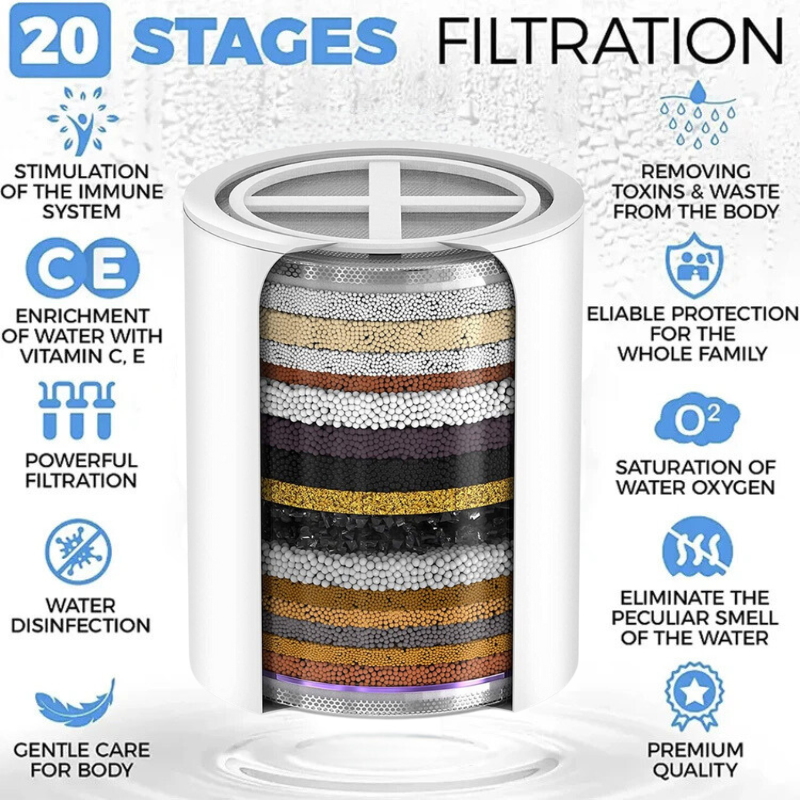 - O Filtro de substituição do chuveiro de parede de 20 estágios apresenta um Processo de filtragem de 20 estágios que elimina todas as impurezas da água do seu chuveiro, incluindo cloro, ferrugem, bactérias, calcário, areia, metais pesados e sujeira.