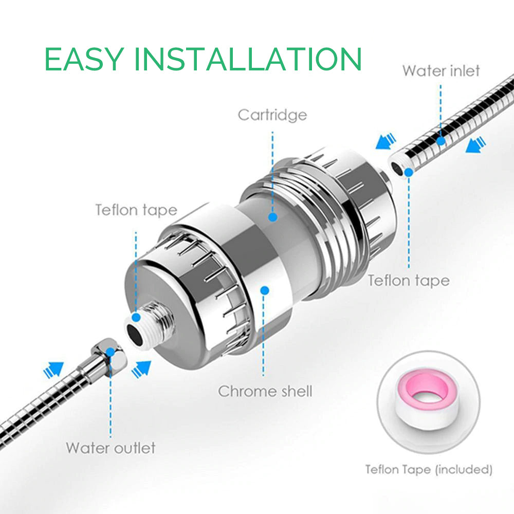 Instale este filtro de chuveiro para água dura com facilidade. Não são necessárias ferramentas, apenas um aperto manual na conexão e um pouco de fita adesiva para encanador, que já está inclusa. Sem vazamentos, sem rachaduras. Adequado para chuveiros de parede, de mão, de chuva e combinados!