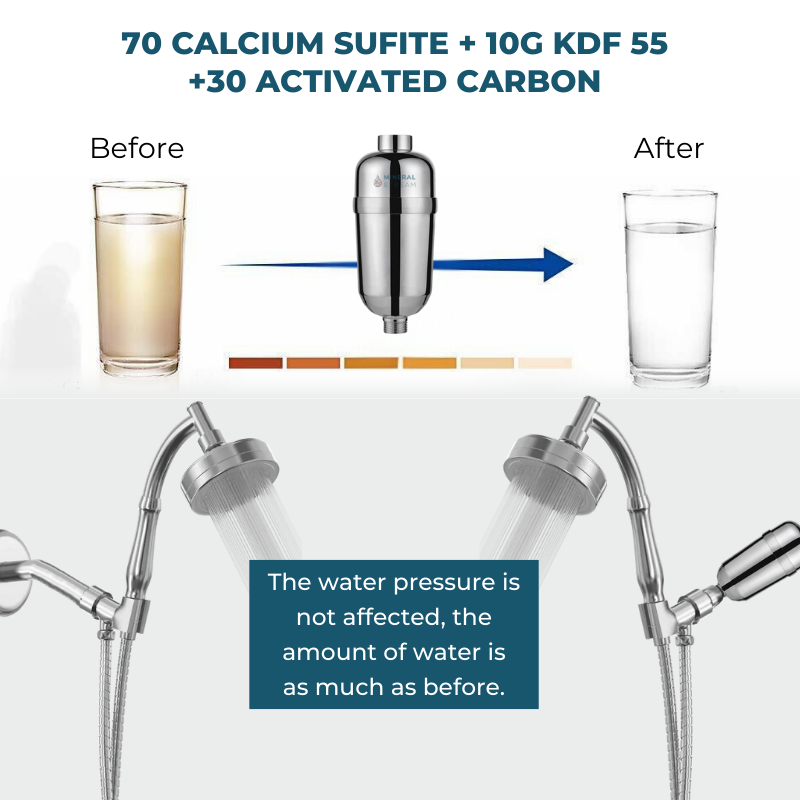 - Carvão Ativado de Coco e KDF-55: Filtra com eficiência produtos químicos nocivos e metais pesados.